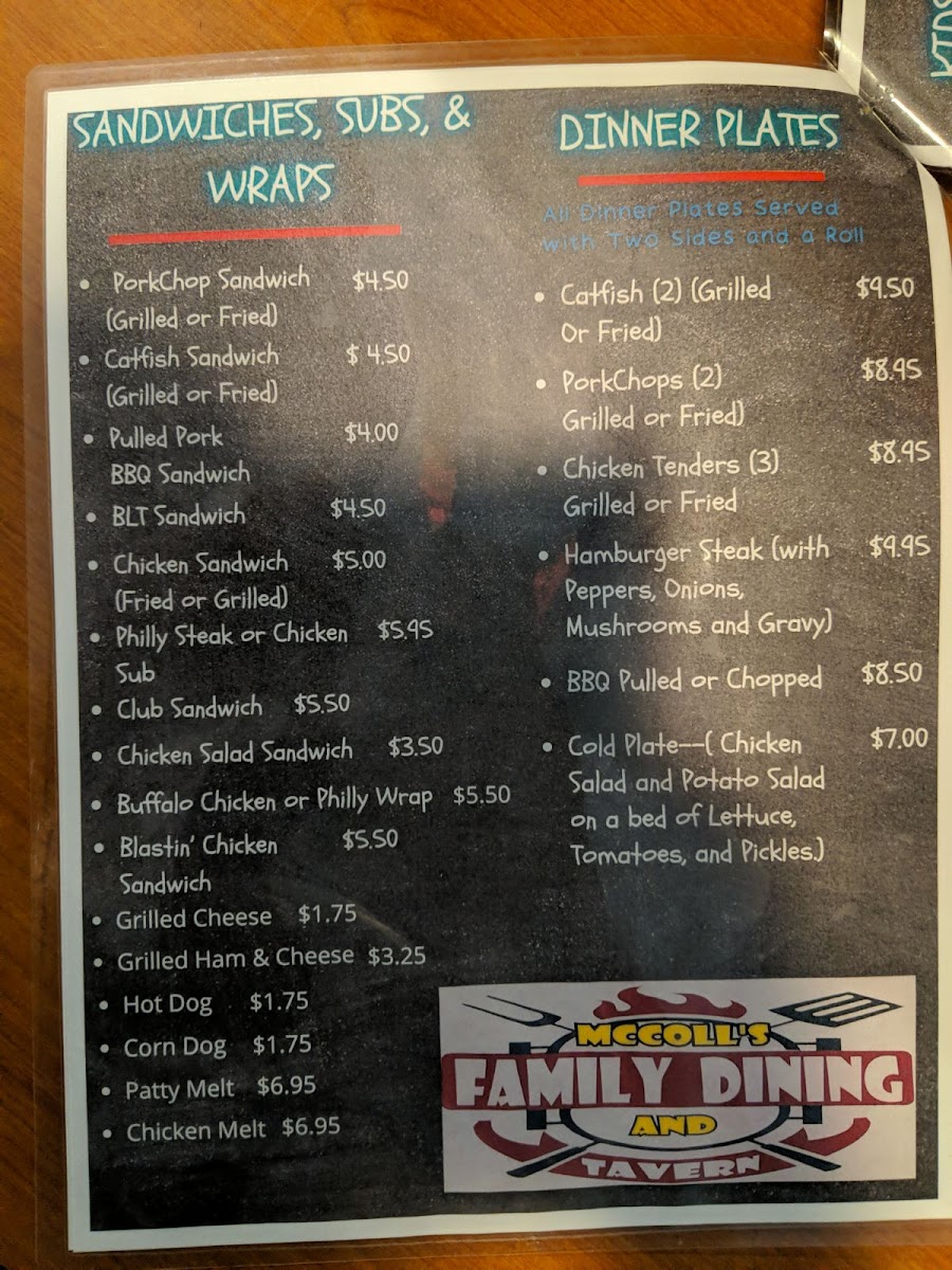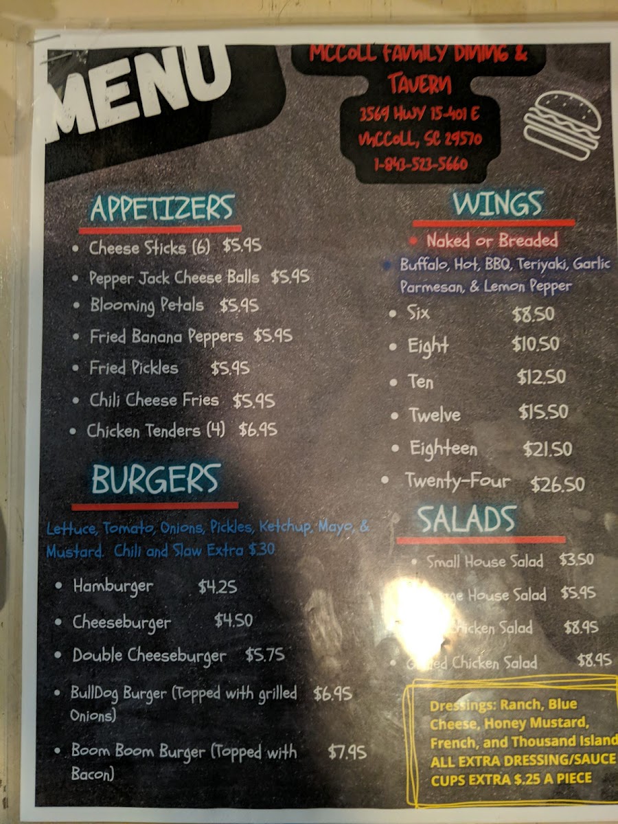 If you're looking for a place where delicious meals and great company come together, Mccoll's Family Dining & Tavern Menu is exactly what you need. Located at 3569 Hwy 15-401 E, McColl, SC, this cozy spot offers a variety of dishes that cater to every taste. Whether you're in the mood for a juicy steak, fresh seafood, or comfort food classics, there's something to satisfy your cravings. The menu is perfect for families, friends, or anyone just looking to enjoy a casual meal with a welcoming atmosphere. With generous portions and flavors that hit the mark, Mccoll's is a great choice for a meal out. So, next time you find yourself in McColl, make sure to stop by and enjoy a hearty meal from their menu - you won't be disappointed!